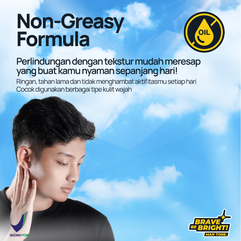 Non-Greasy Formula : Tekstur ringan, cepat meresap, dan bebas kilap meski digunakan saat berkeringat, cocok untuk digunakan segala jenis kulit.