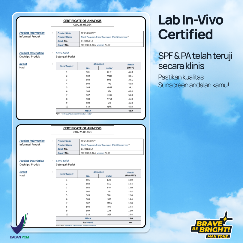 Broad Spectrum Shield : Perlindungan UVA + UVB untuk mencegah sunburn & penuaan dini.